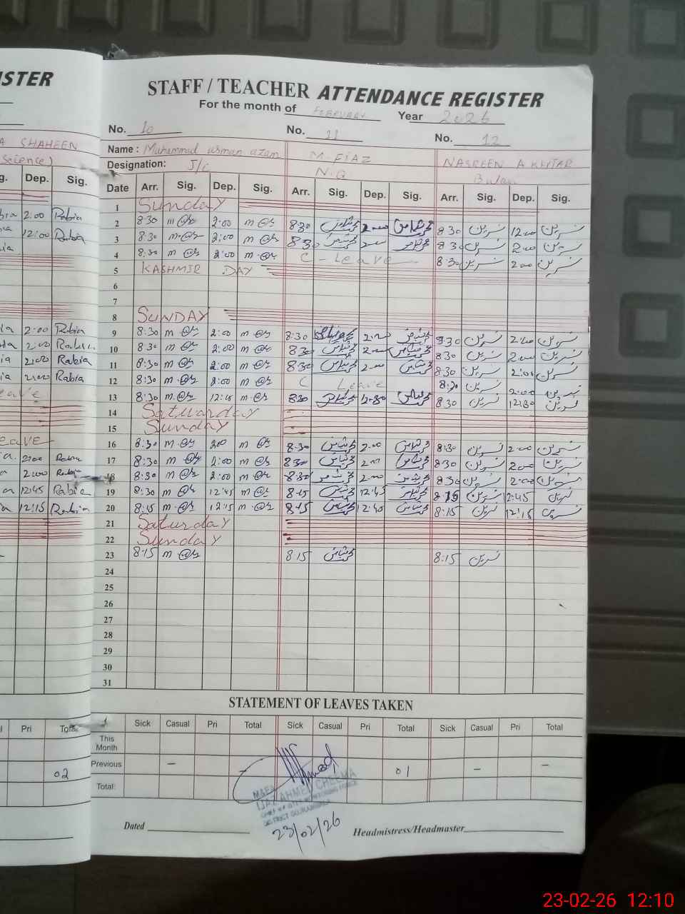 | CNIC | Full Name | Designation | R/C | Absence During Last Calender Month |