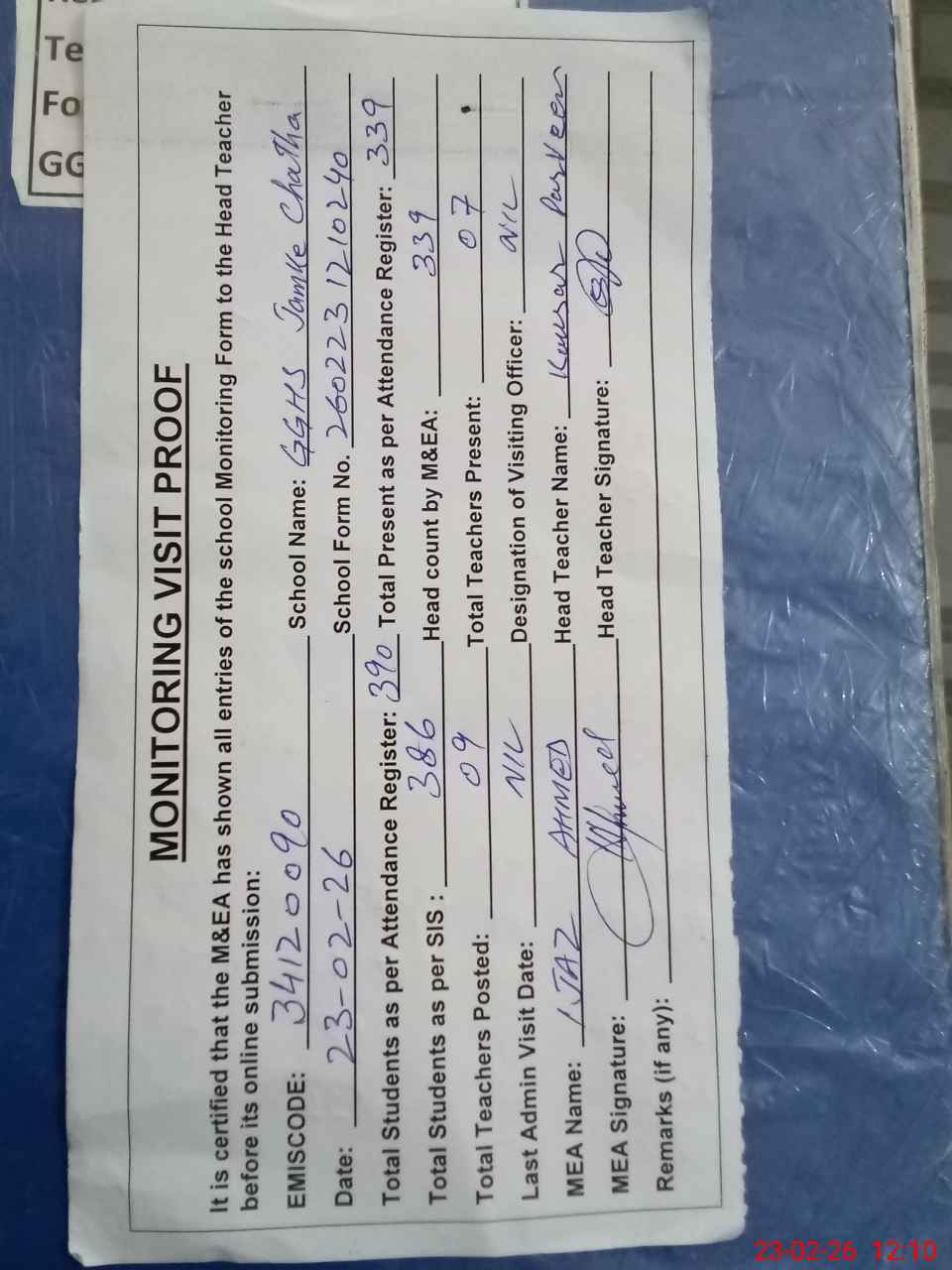 | Attendance Register | Head Teacher | MEA with School | Visit Proof |