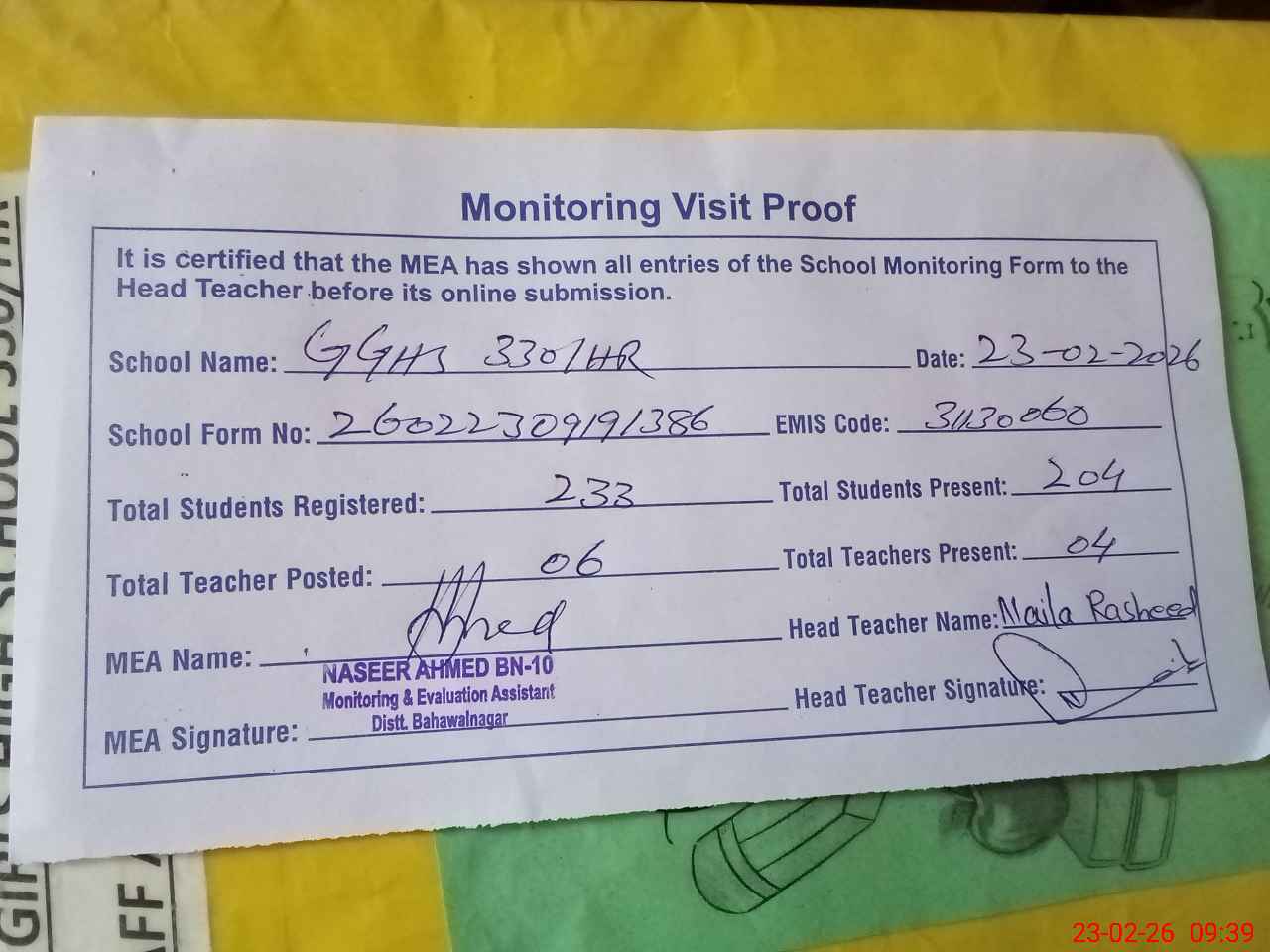 | EMIS Code: 31130060 | Name of School: GGHS CHAK NO 330 HR | |||
