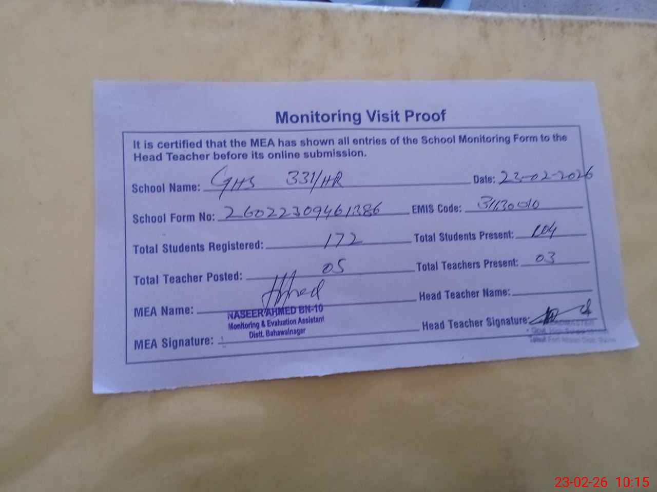 | EMIS Code: 31130010 | Name of School: GHS CHAK 331/HR | |||
