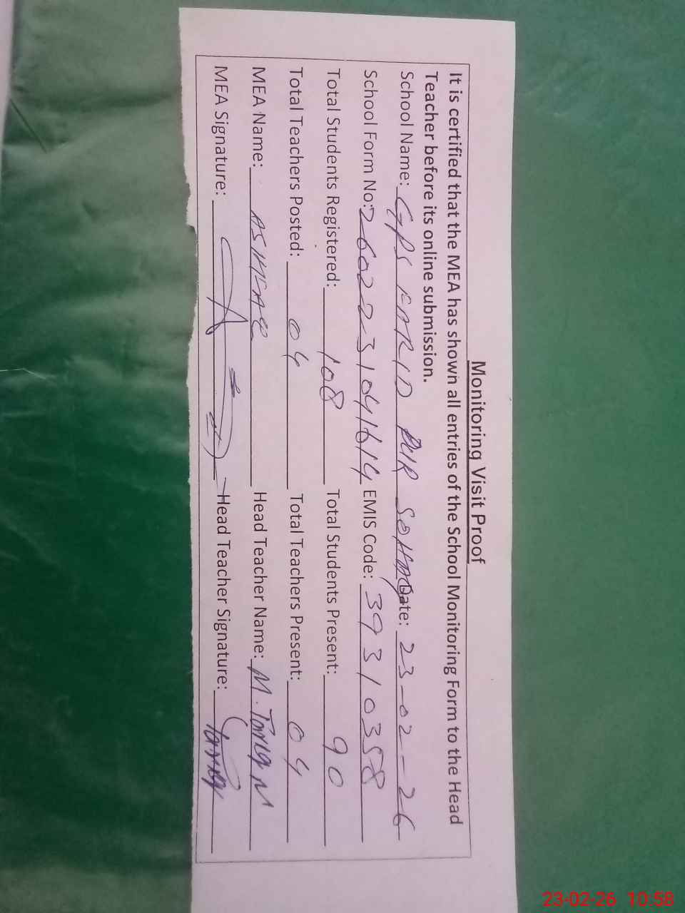 | Attendance Register | Head Teacher | MEA with School | Visit Proof |