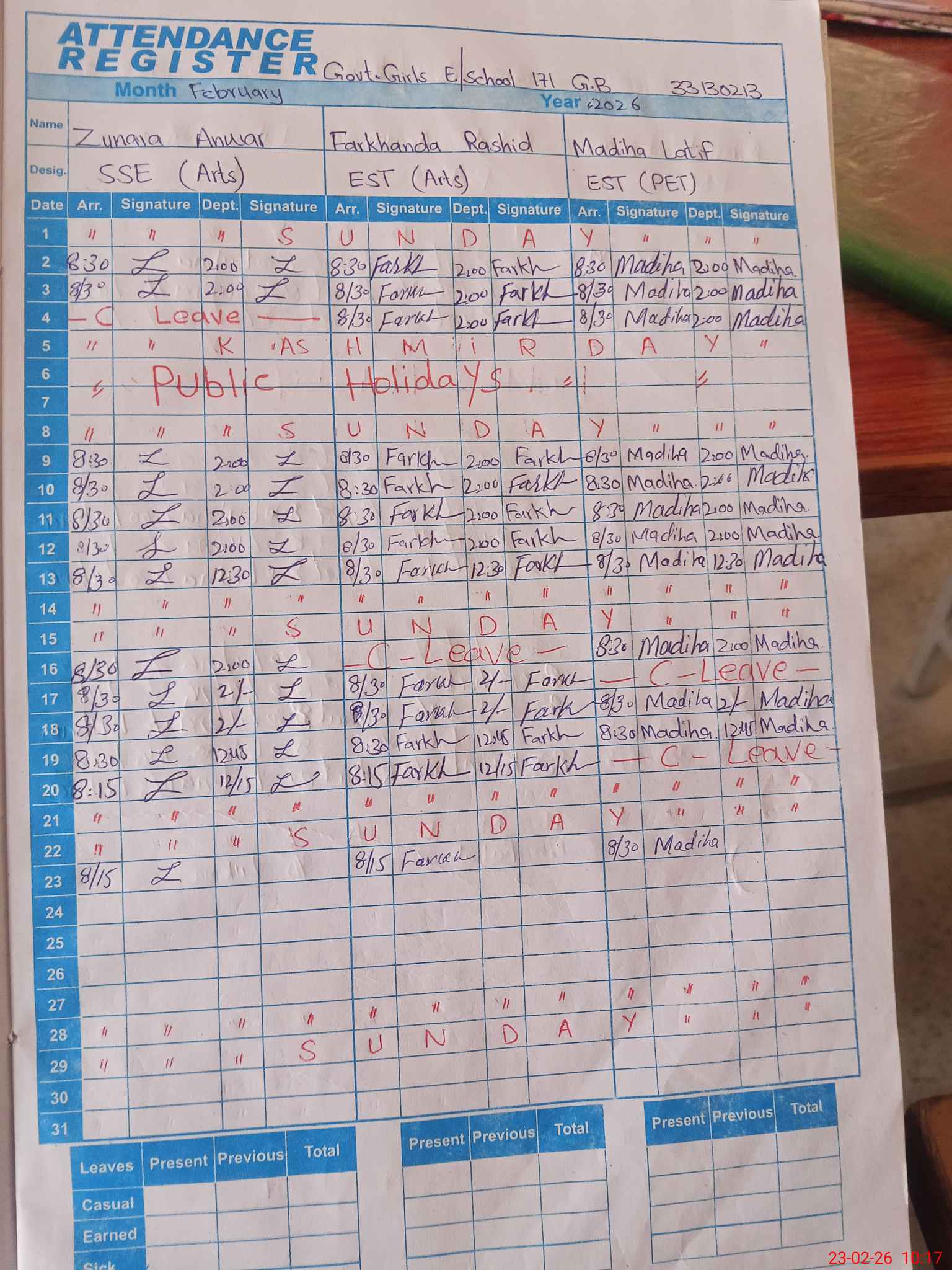 | CNIC | Full Name | Designation | R/C | Absence During Last Calender Month |