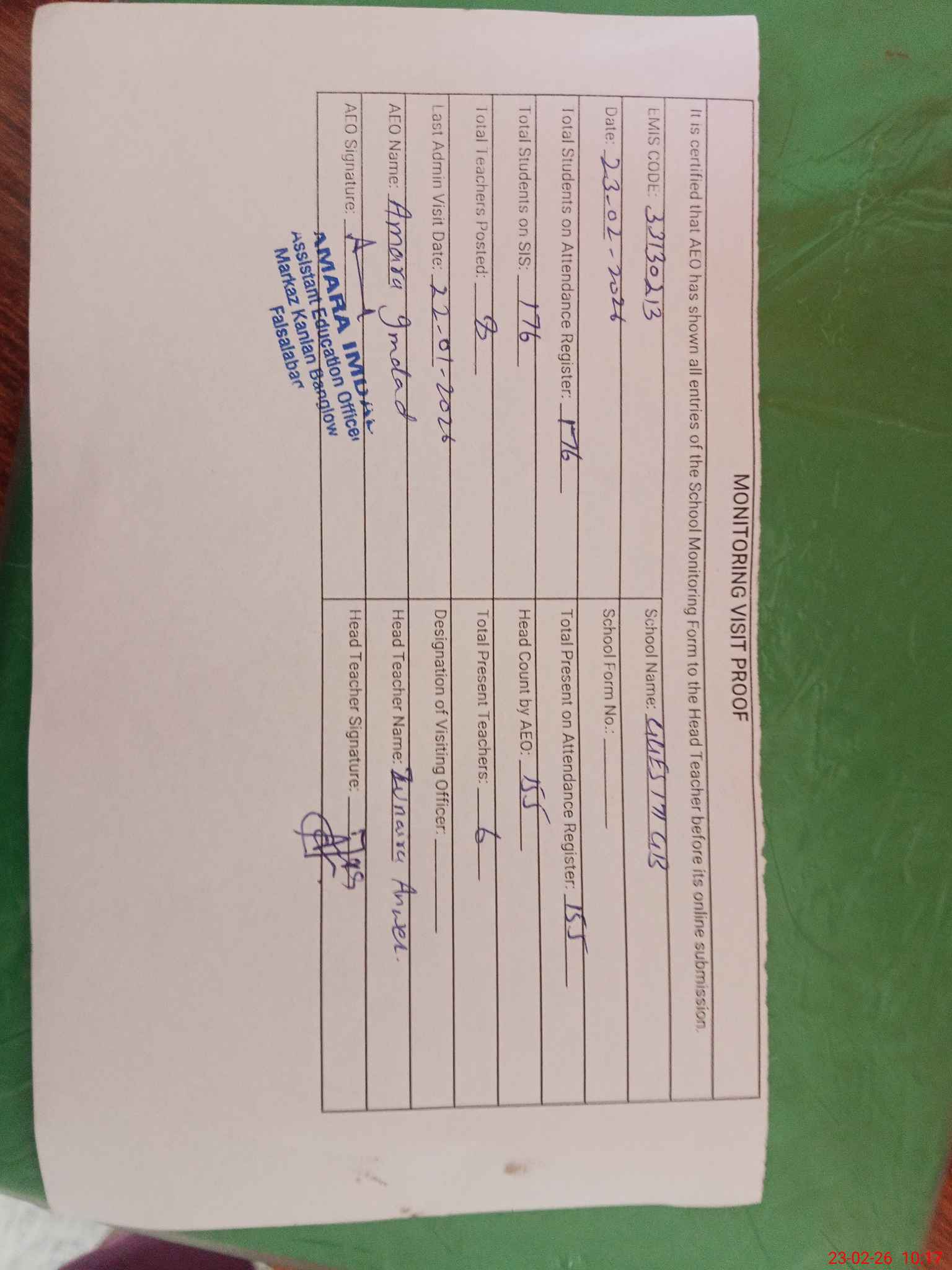 | Attendance Register | Head Teacher | MEA with School | Visit Proof |