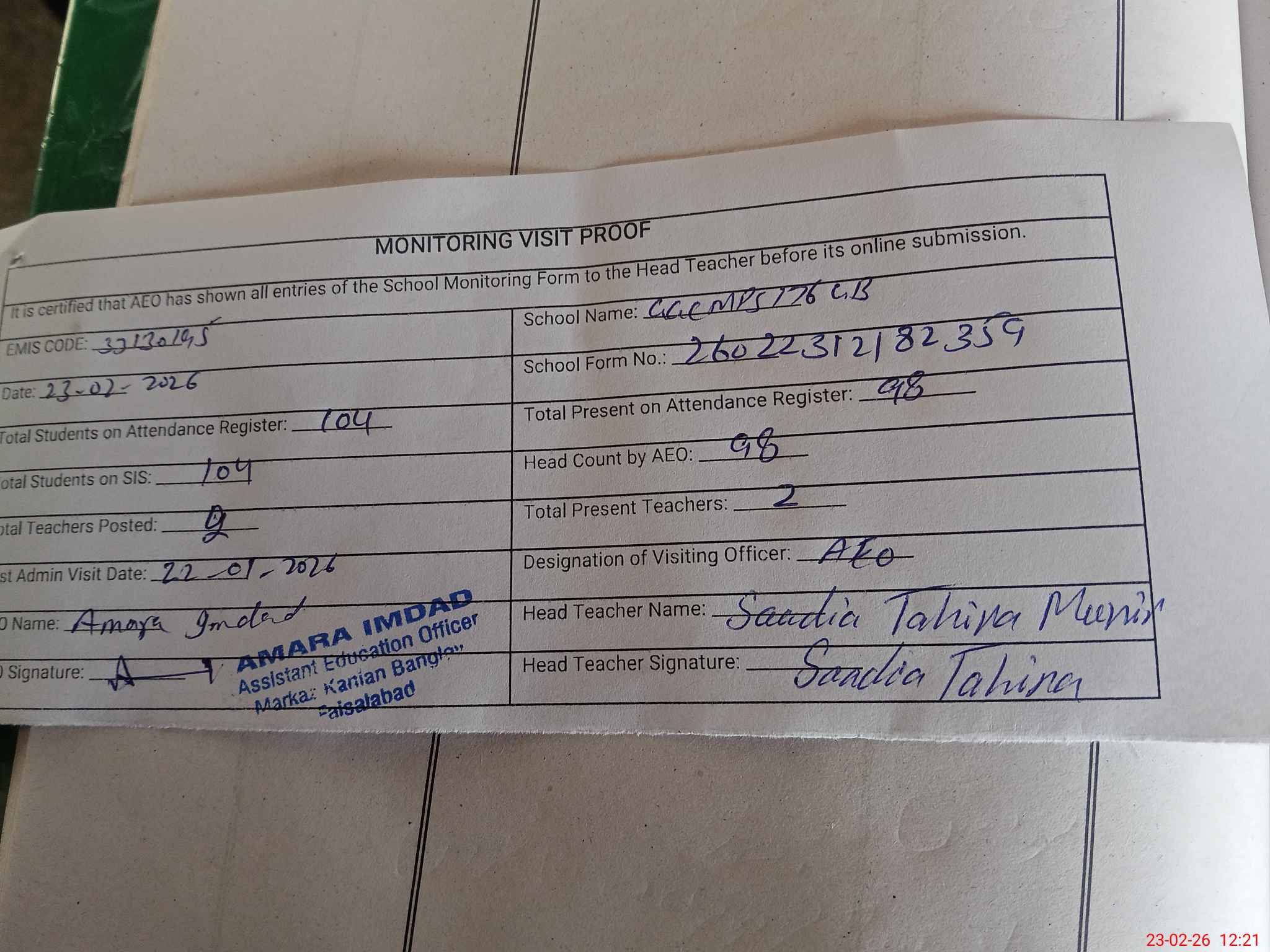 | EMIS Code: 33130195 | Name of School: GGCMS CHAK 176 GB SAMUNDRI | |||