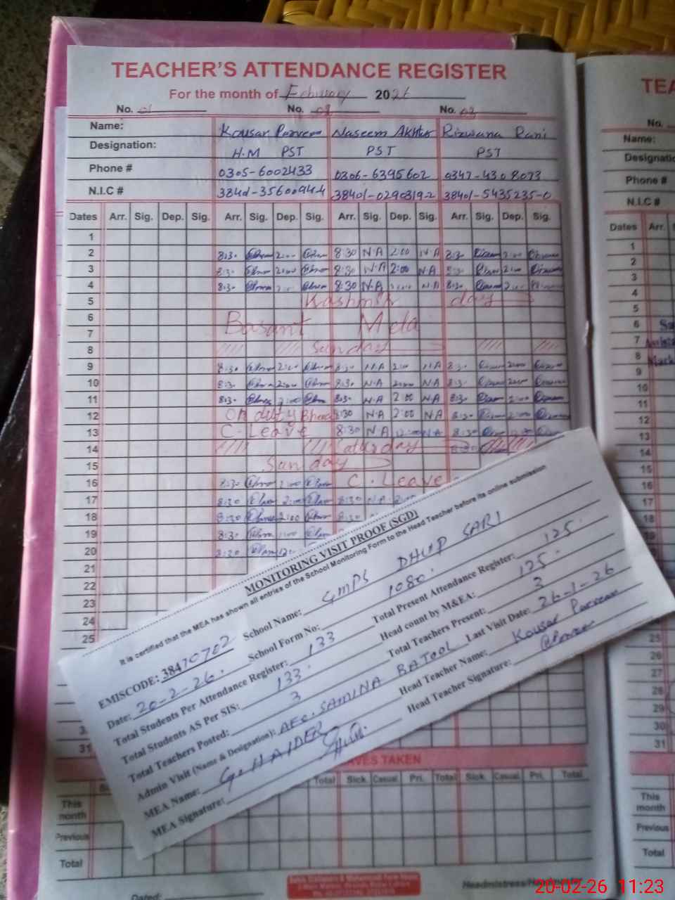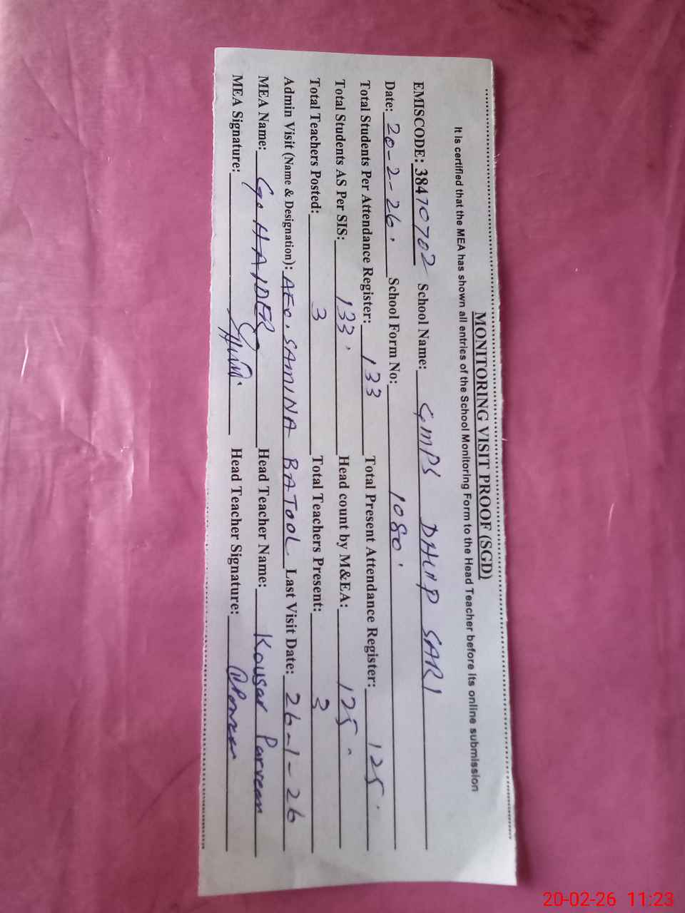 | Attendance Register | Head Teacher | MEA with School | Visit Proof |