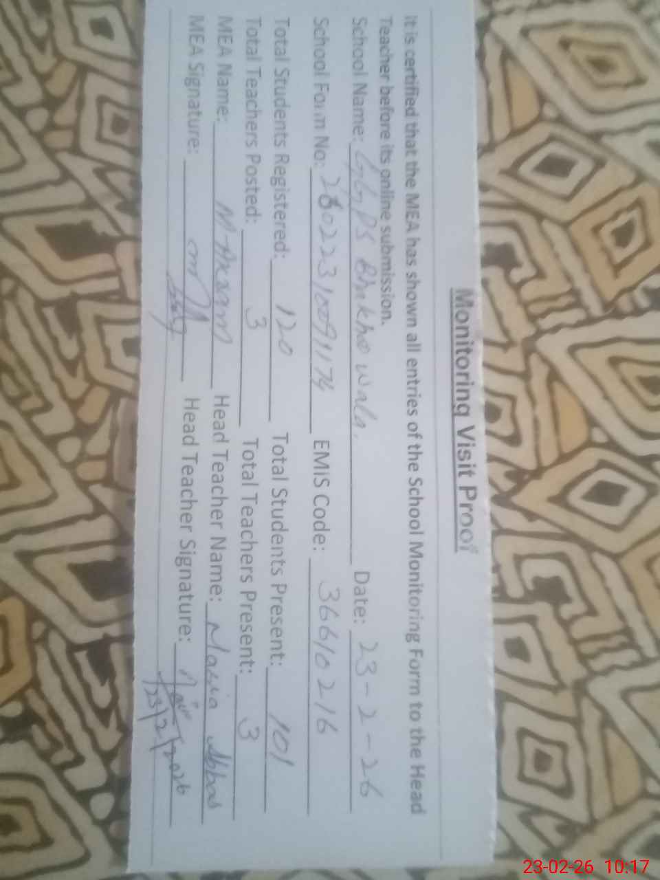 | Attendance Register | Head Teacher | MEA with School | Visit Proof |
