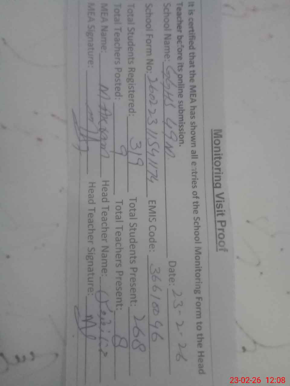 | Attendance Register | Head Teacher | MEA with School | Visit Proof |