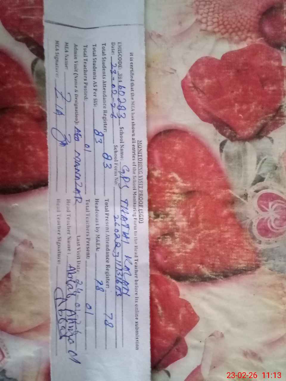 | Attendance Register | Head Teacher | MEA with School | Visit Proof |