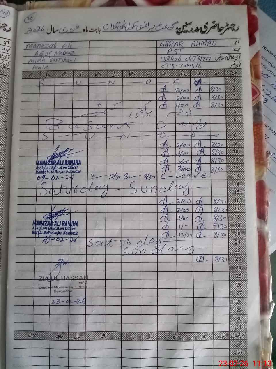 | Name: IB**** AH**** Designation: (School Headmaster's/Headmistress's) PST Phone/Cell Number: 03**** |