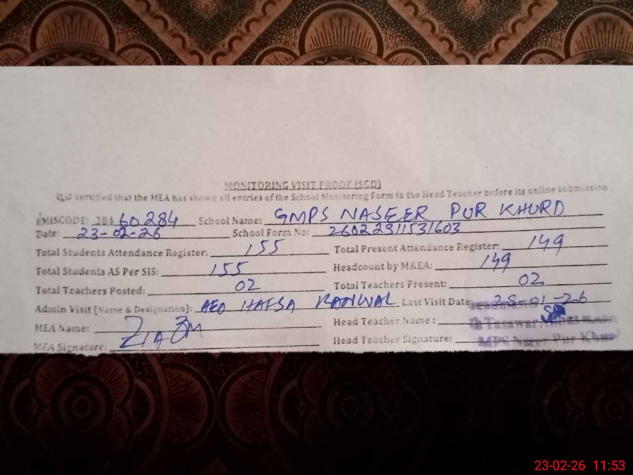 | EMIS Code: 38460284 | Name of School: GMPS NASEER PUR KHURD | |||