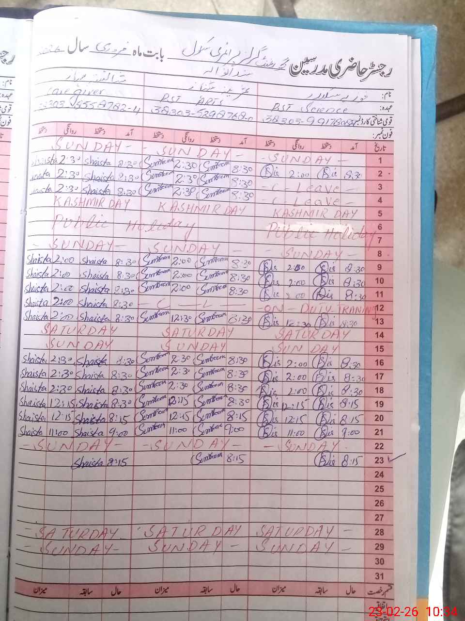 | Total no. of Classrooms: 4 No. of Classrooms Used for Teaching: 3 No. of Classrooms Storing Old Furniture, FTBs, etc: 0Comments if Any: Student attendance of ECE class marked in the register was fake because 14 students were present instead of 27 and afternoon shift students are 22 instead of 36 |