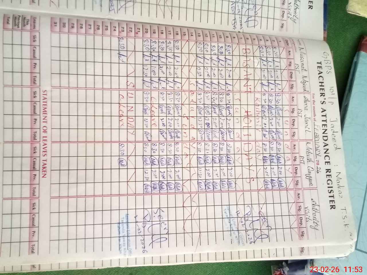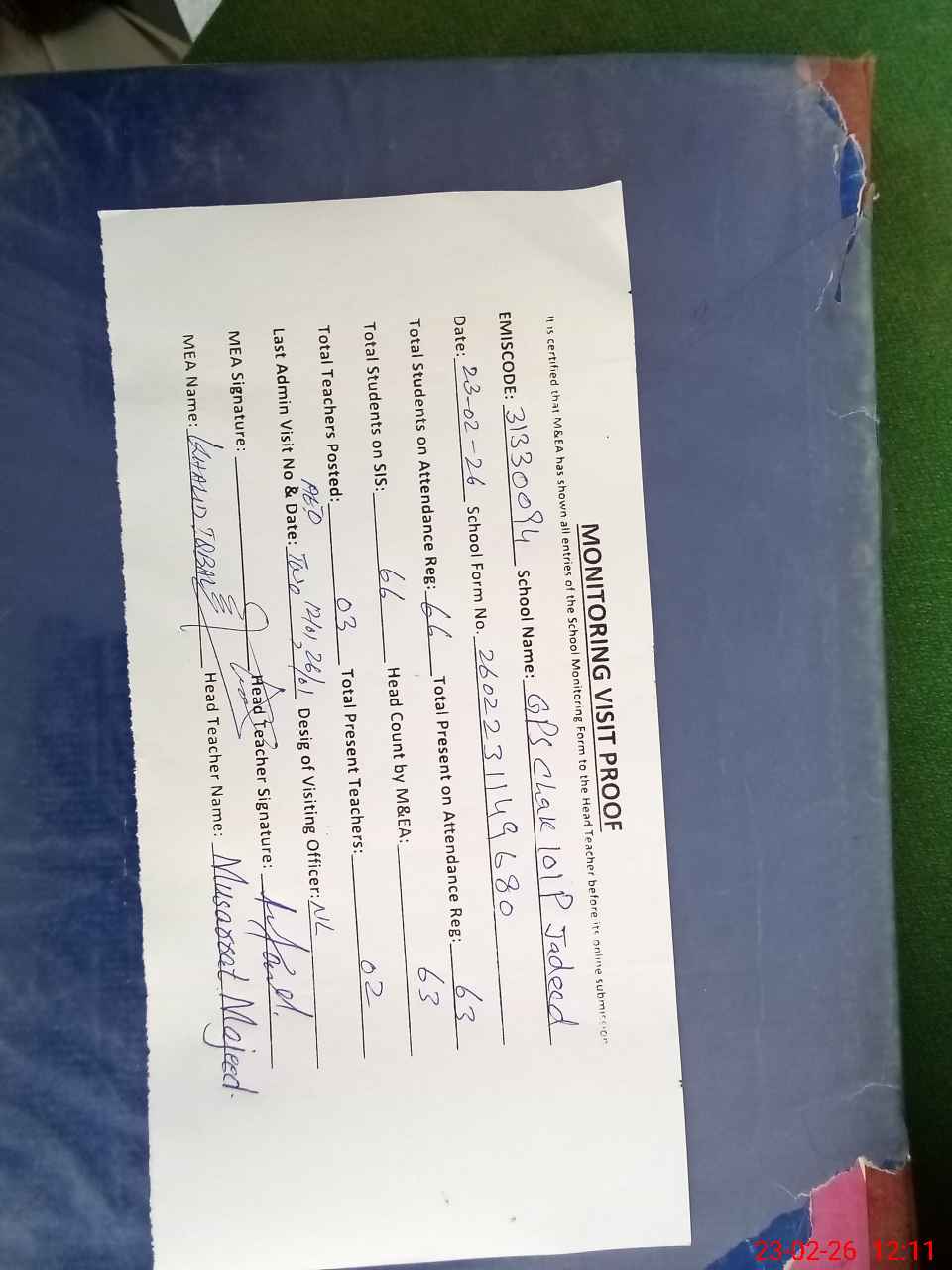 | Attendance Register | Head Teacher | MEA with School | Visit Proof |