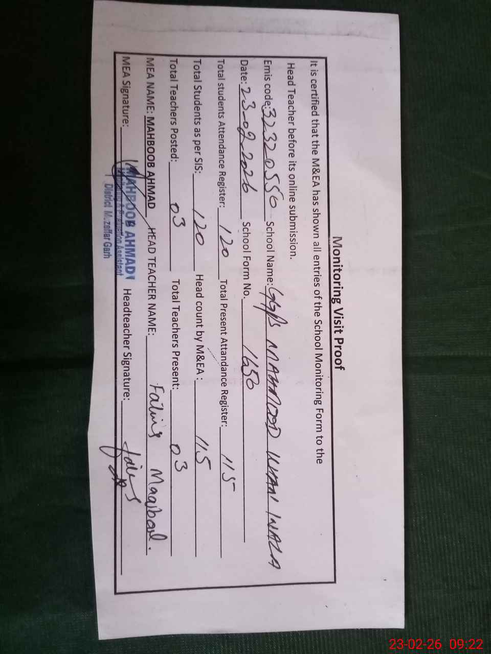 | EMIS Code: 32320550 | Name of School: GGPS MAHMOOD KHAN WALA | |||