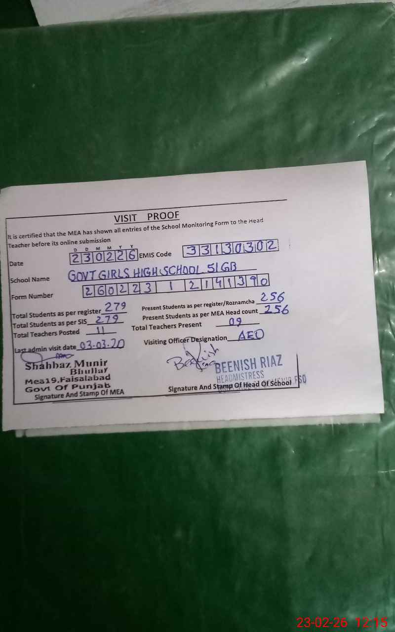 | EMIS Code: 33130302 | Name of School: GGHS CHAK NO 51 GB ST DOMENIC | |||