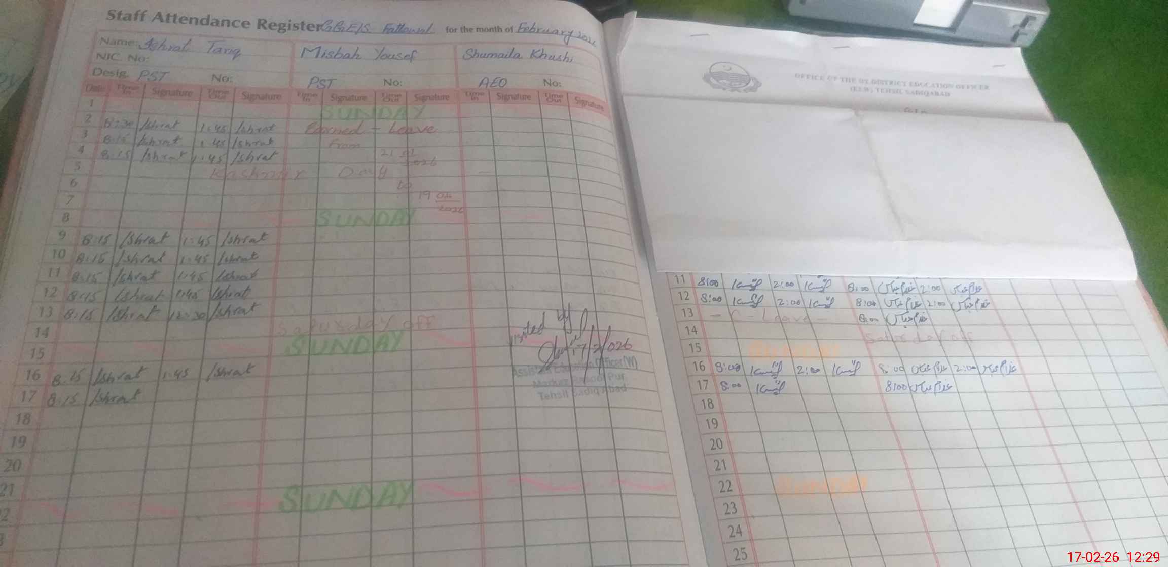 | Name: No**** Fa**** Designation: (School Headmaster's/Headmistress's) EST SCI Phone/Cell Number: 03**** |