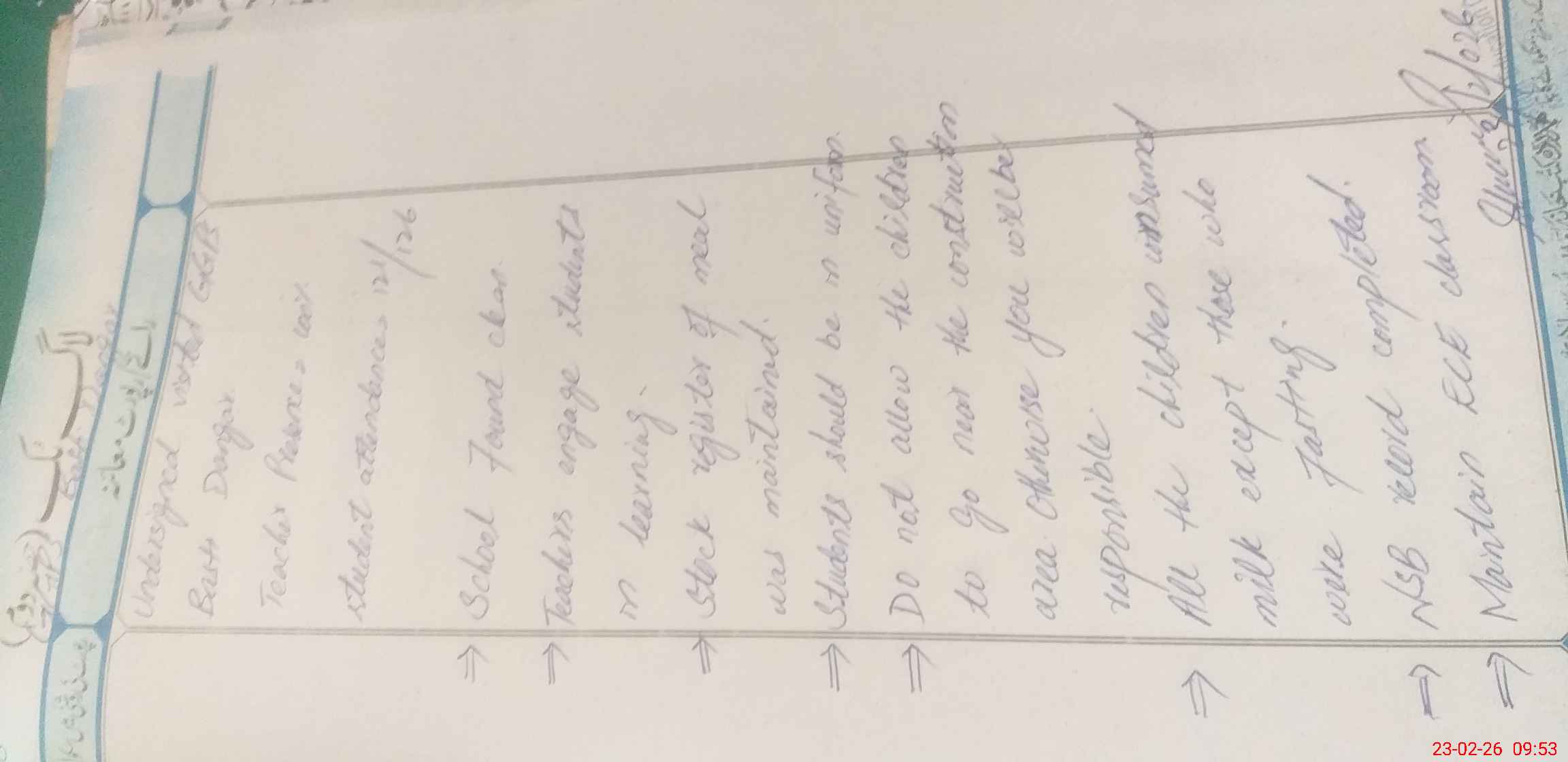 | Attendance Register | Head Teacher | MEA with School | Visit Proof |