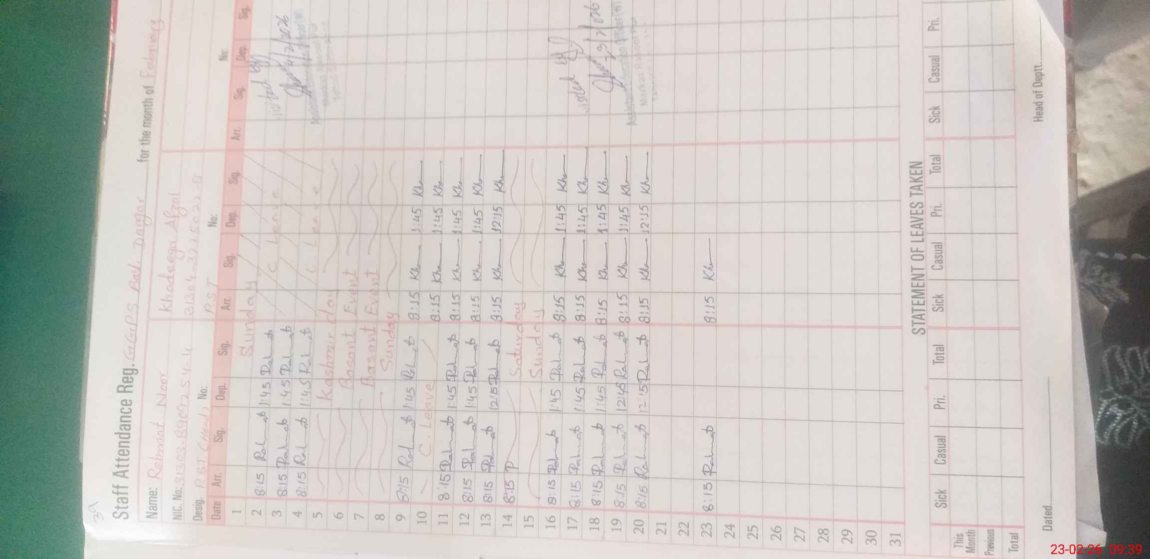 | CNIC | Full Name | Designation | R/C | Absence During Last Calender Month |