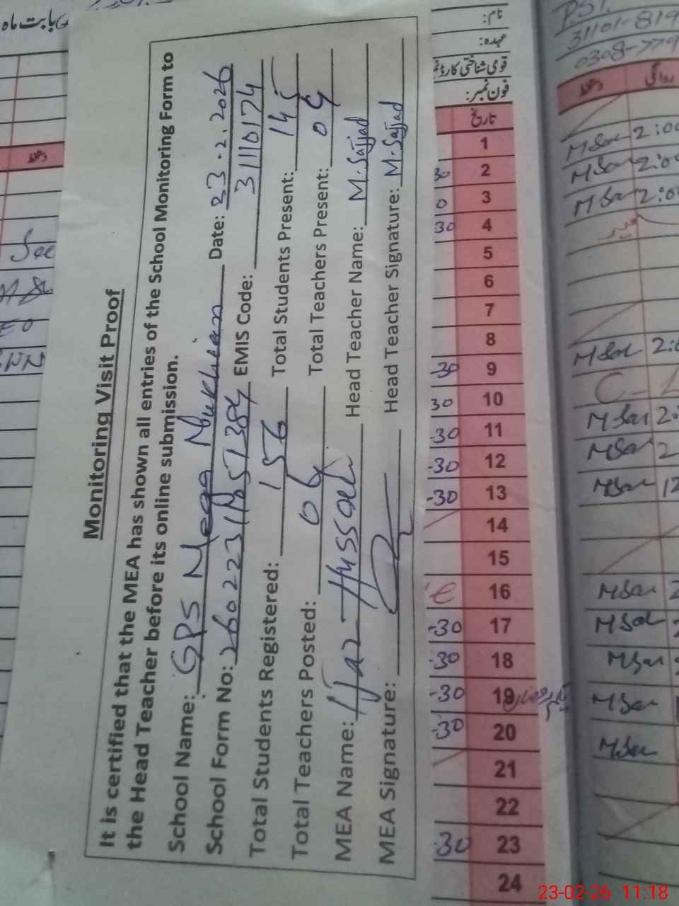 | Attendance Register | Head Teacher | MEA with School | Visit Proof |