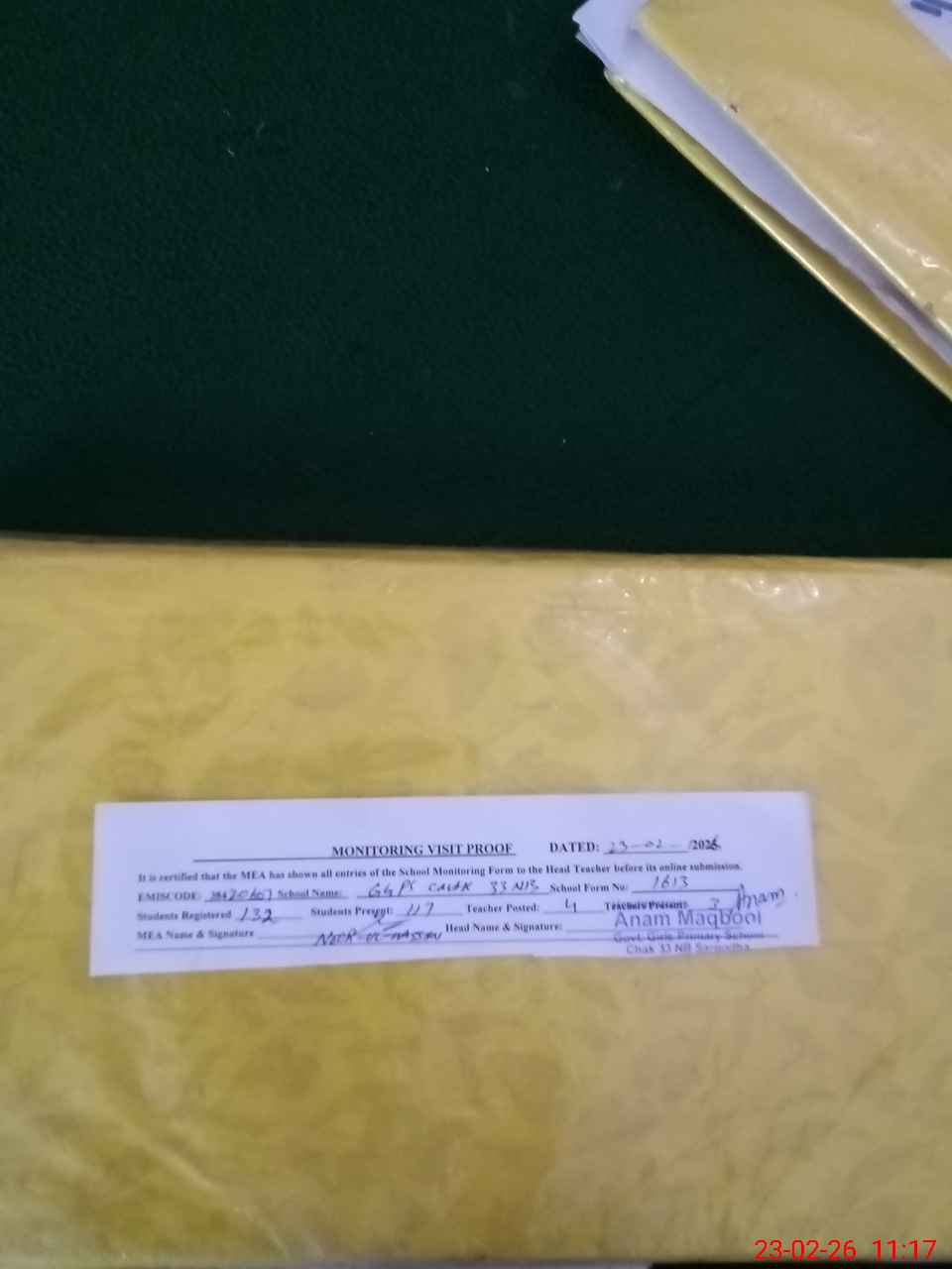 | Attendance Register | Head Teacher | MEA with School | Visit Proof |