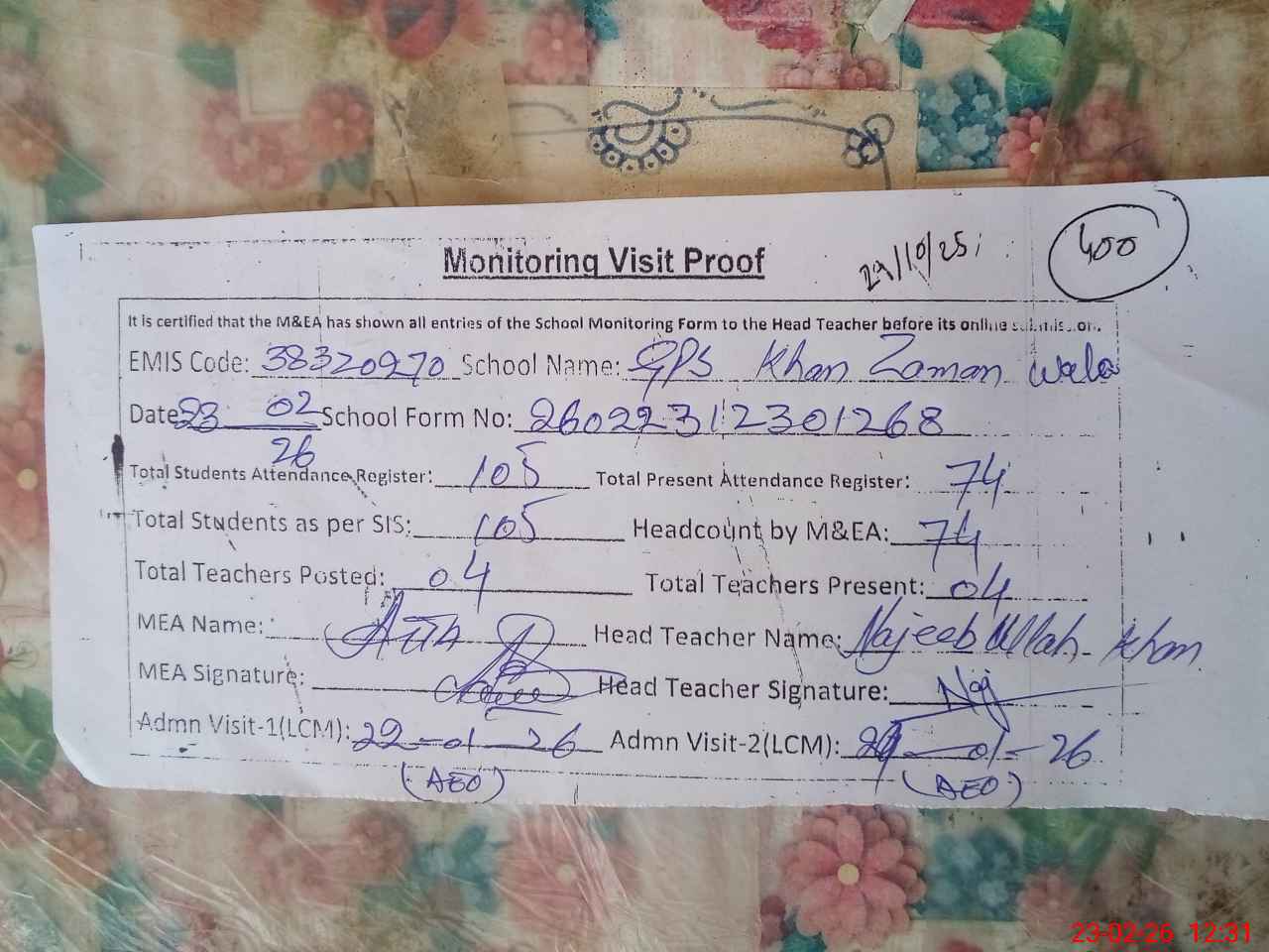 | Attendance Register | Head Teacher | MEA with School | Visit Proof |