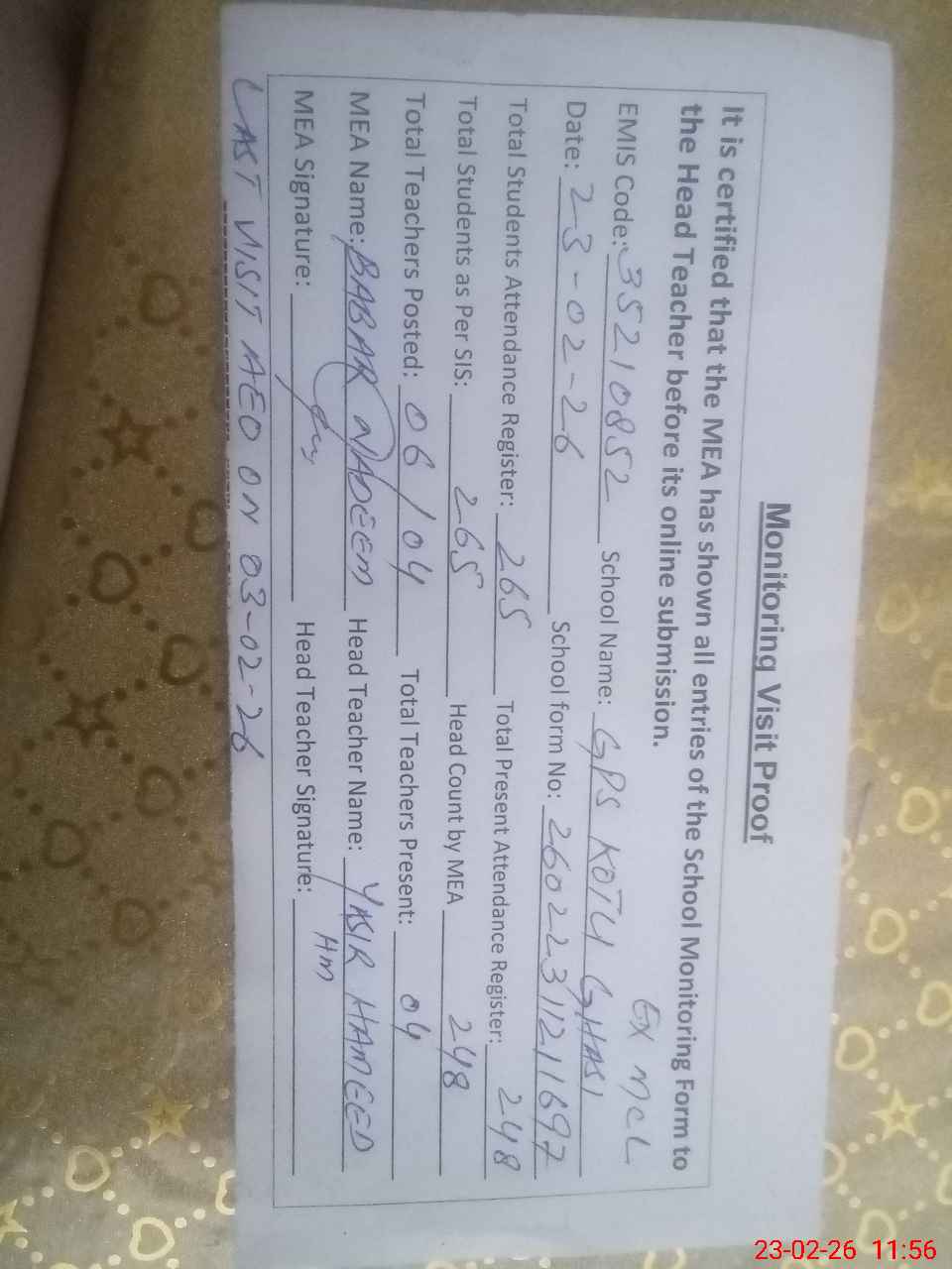 | Attendance Register | Head Teacher | MEA with School | Visit Proof |