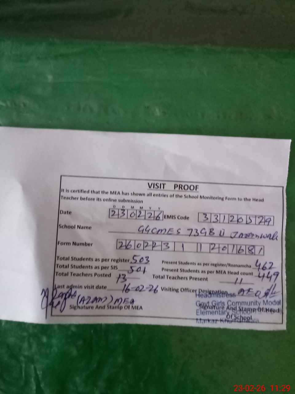 | Attendance Register | Head Teacher | MEA with School | Visit Proof |