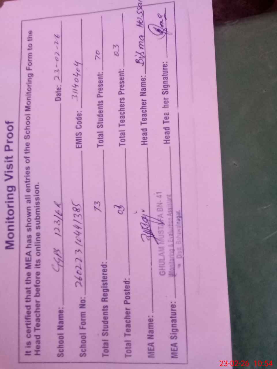 | Attendance Register | Head Teacher | MEA with School | Visit Proof |