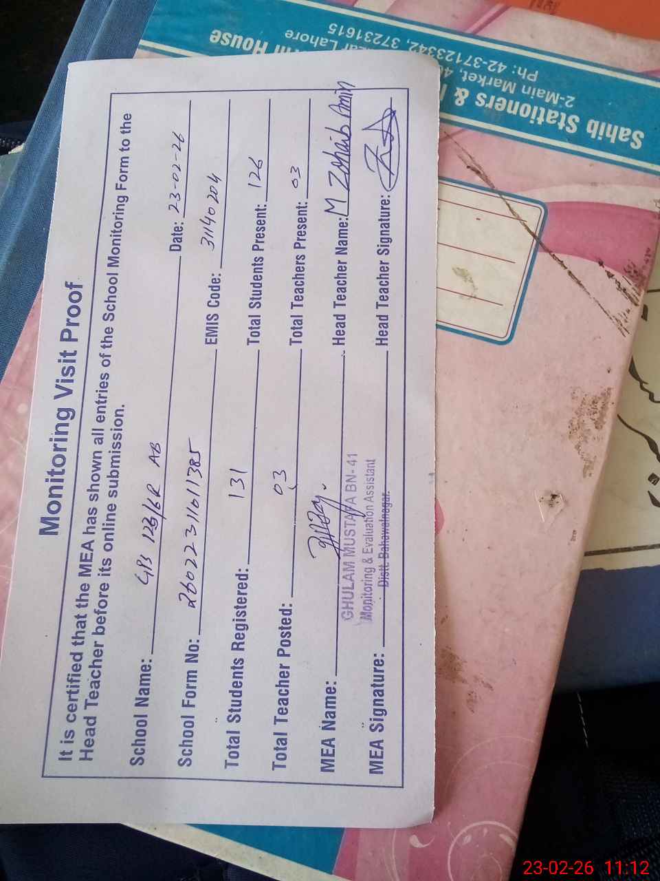 | Attendance Register | Head Teacher | MEA with School | Visit Proof |
