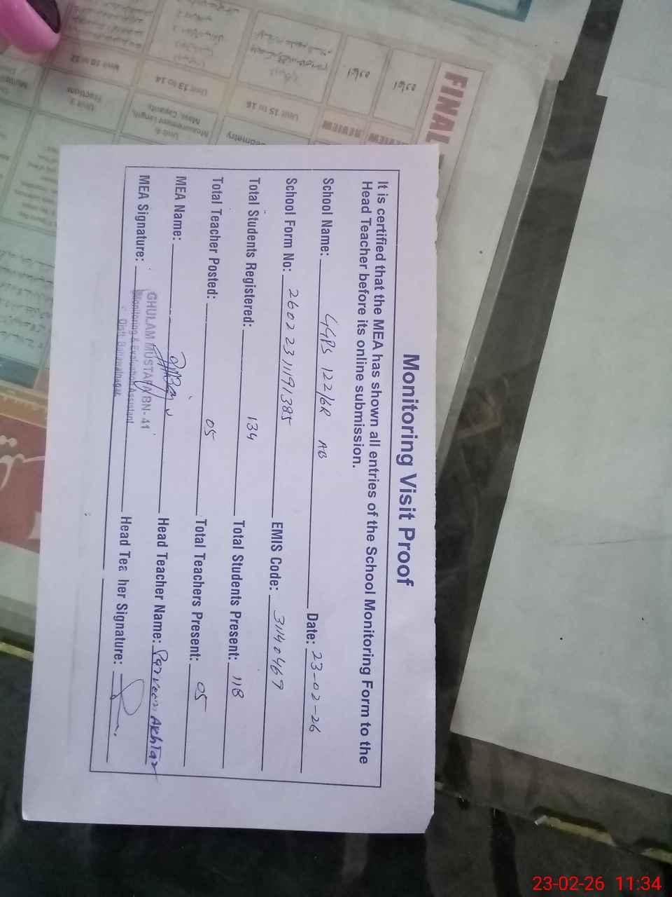 | Attendance Register | Head Teacher | MEA with School | Visit Proof |