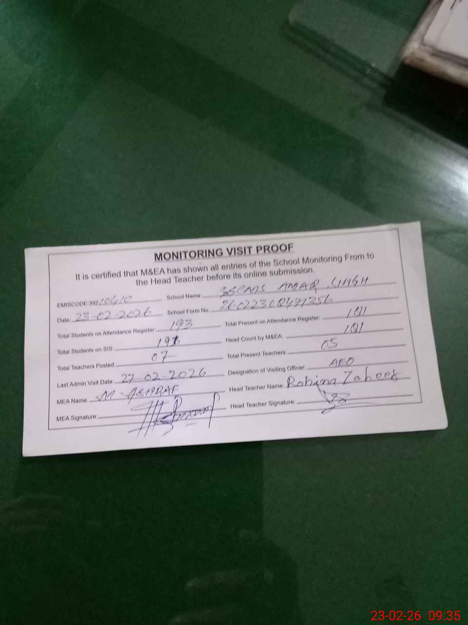 | Attendance Register | Head Teacher | MEA with School | Visit Proof |