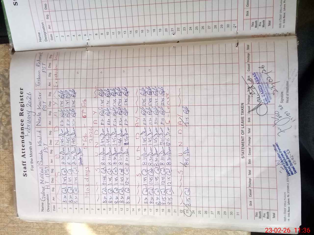 | CNIC | Full Name | Designation | R/C | Absence During Last Calender Month |