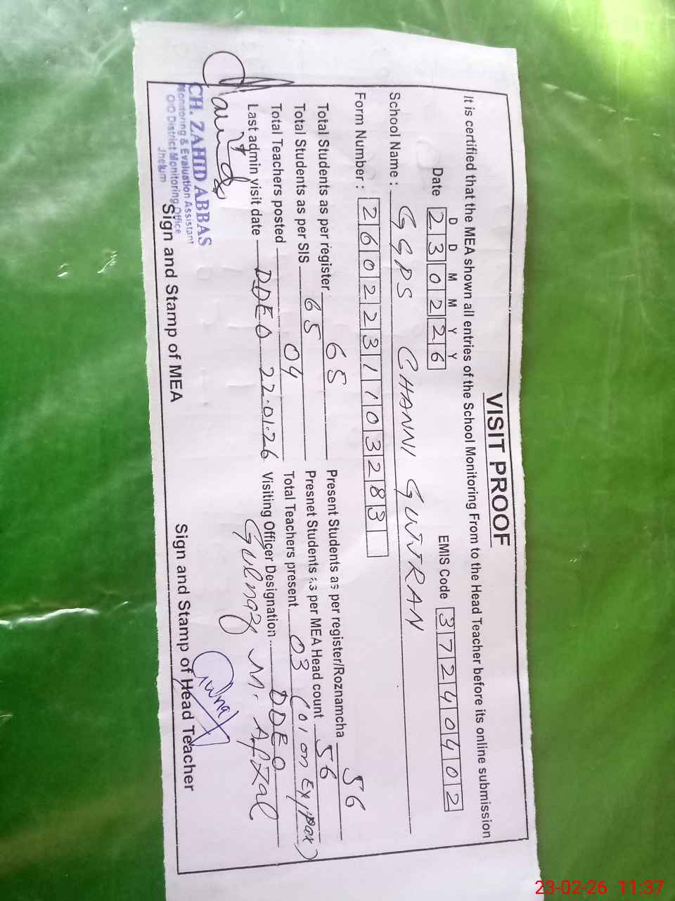 | EMIS Code: 37240402 | Name of School: GGPS CHHANI GUJRAN | |||