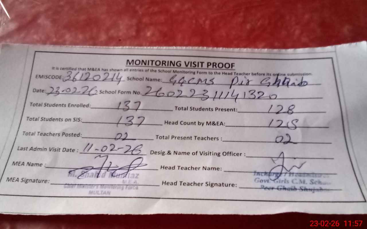 | EMIS Code: 36120214 | Name of School: GGCMS PIR GHAIB P/O SHUJABAD | |||