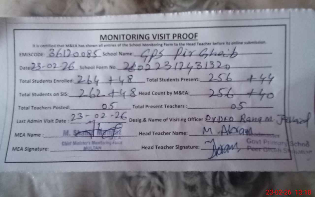 | EMIS Code: 36120085 | Name of School: GPS PIR GHAIB P/O PIR GHAIB MOUZA HILAL WAJEH | |||