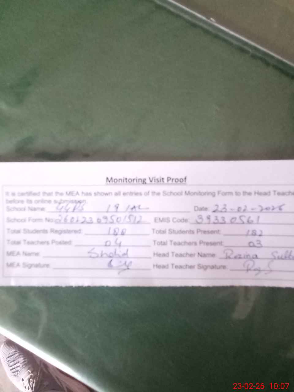 | Attendance Register | Head Teacher | MEA with School | Visit Proof |