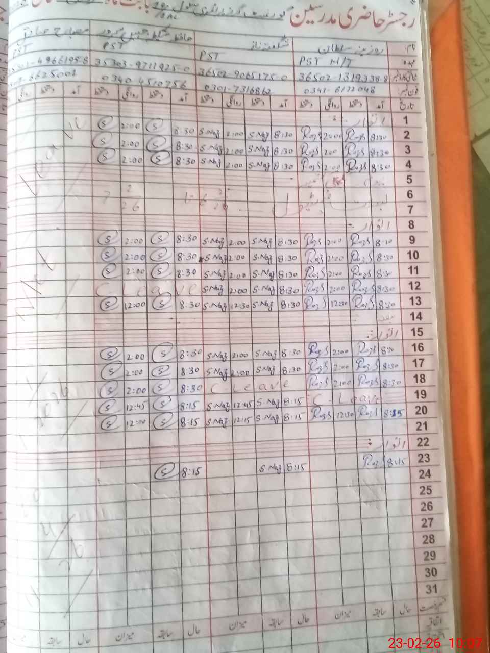 | CNIC | Full Name | Designation | R/C | Absence During Last Calender Month |