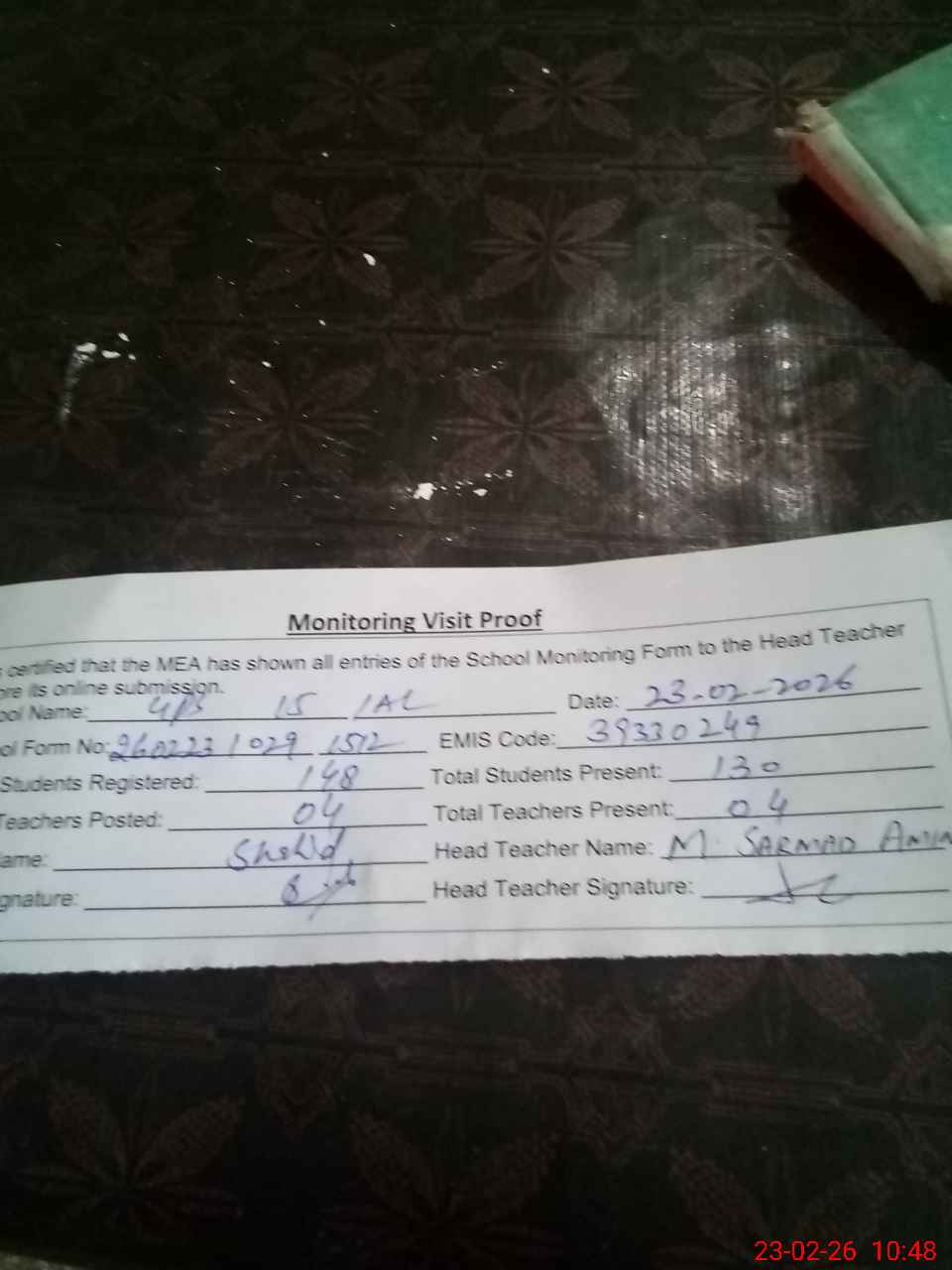 | Attendance Register | Head Teacher | MEA with School | Visit Proof |