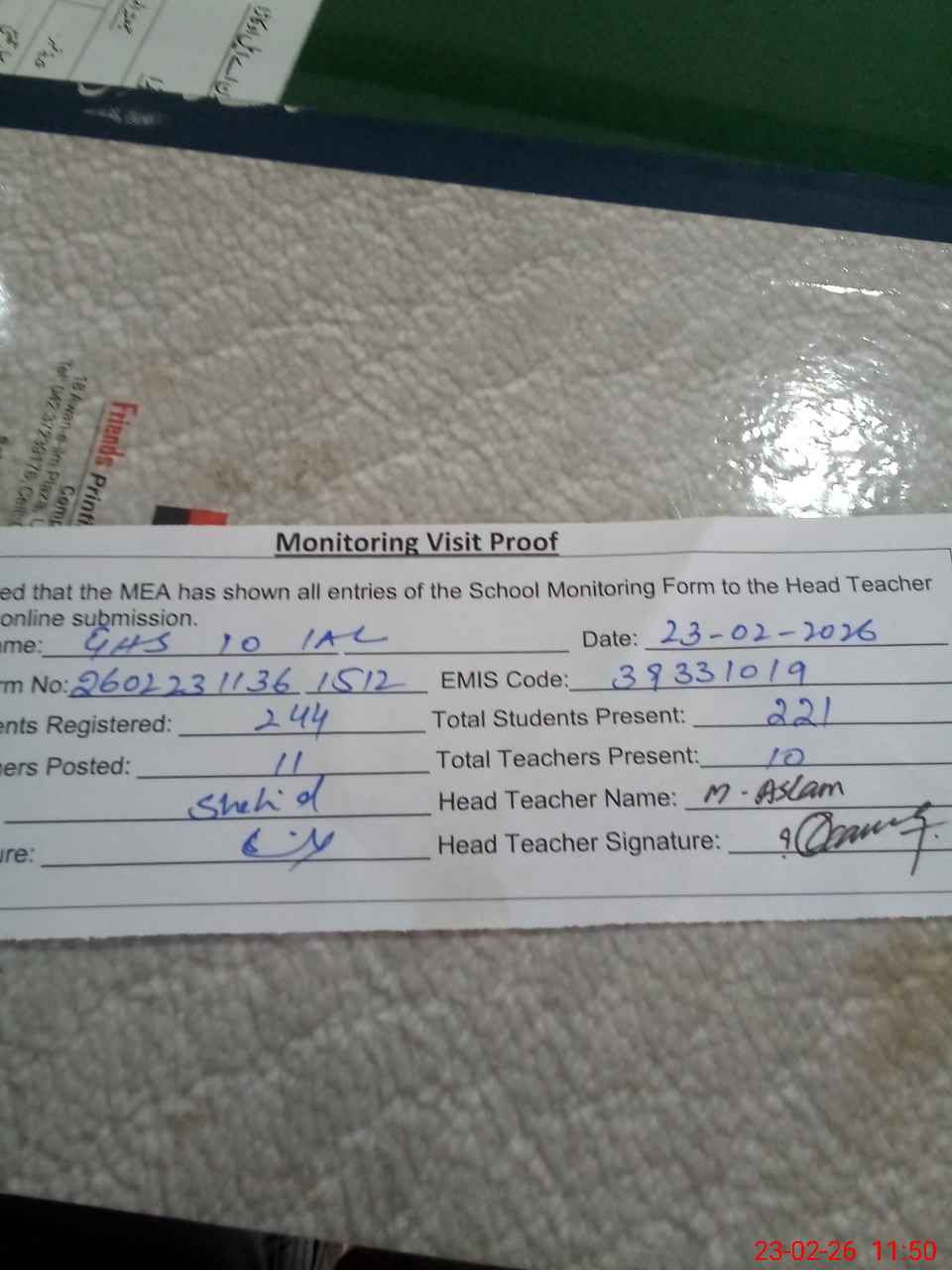 | Attendance Register | Head Teacher | MEA with School | Visit Proof |