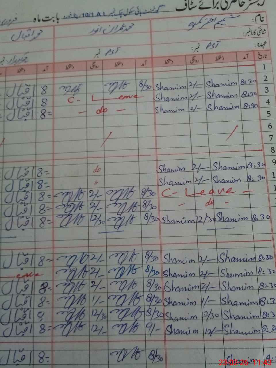 | CNIC | Full Name | Designation | R/C | Absence During Last Calender Month |