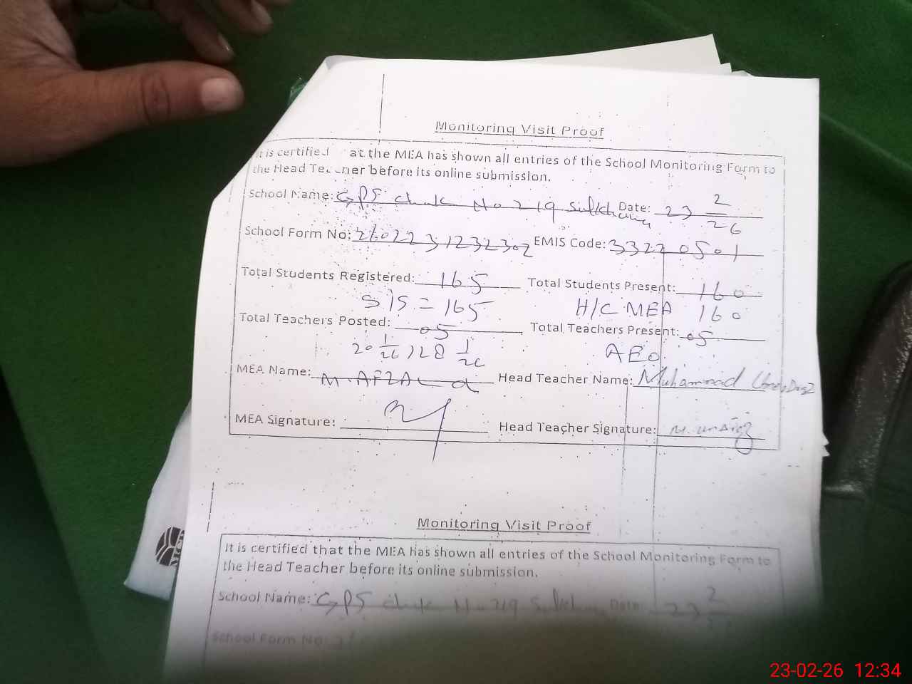 | Attendance Register | Head Teacher | MEA with School | Visit Proof |