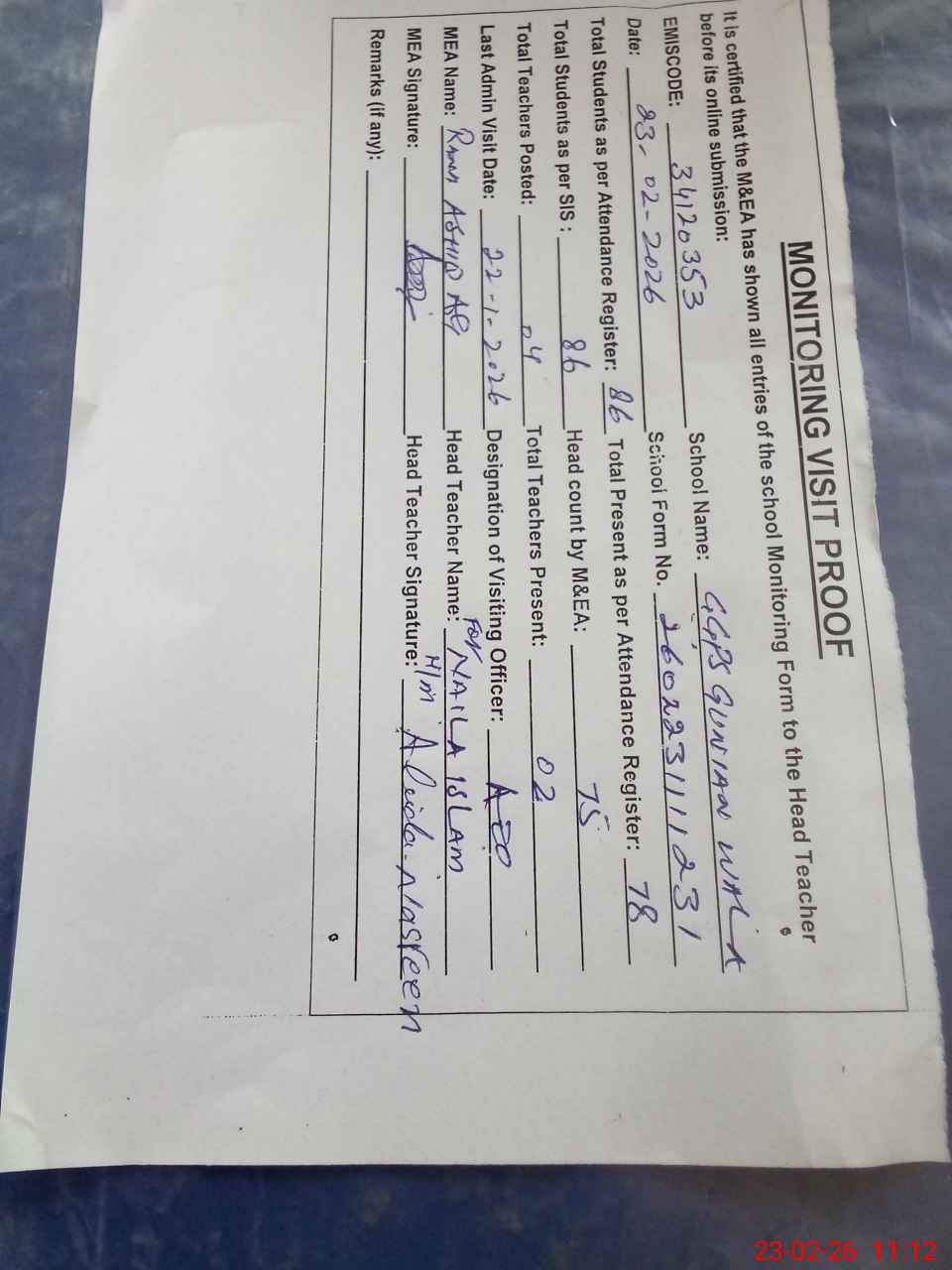 | Attendance Register | Head Teacher | MEA with School | Visit Proof |
