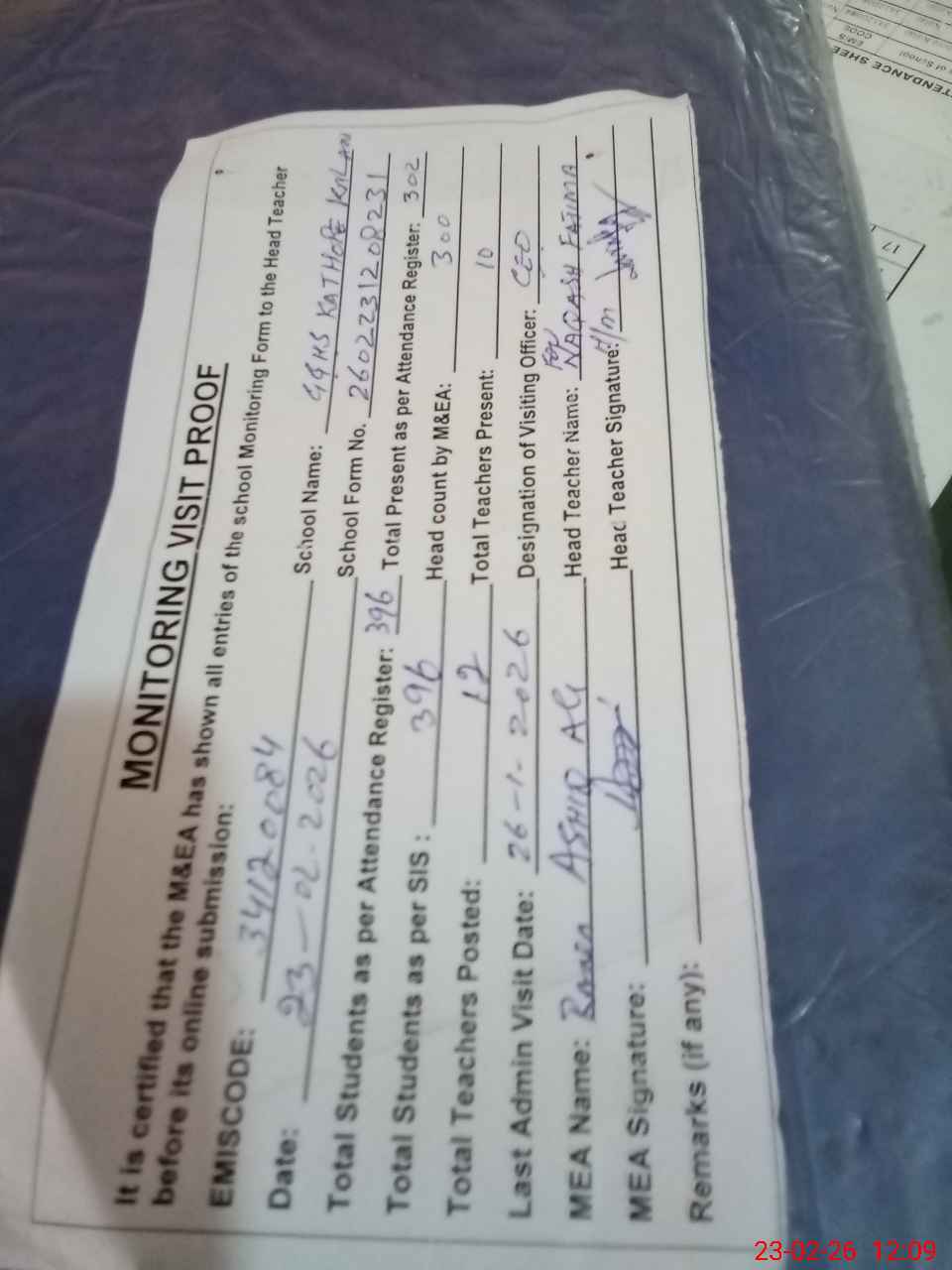 | Attendance Register | Head Teacher | MEA with School | Visit Proof |