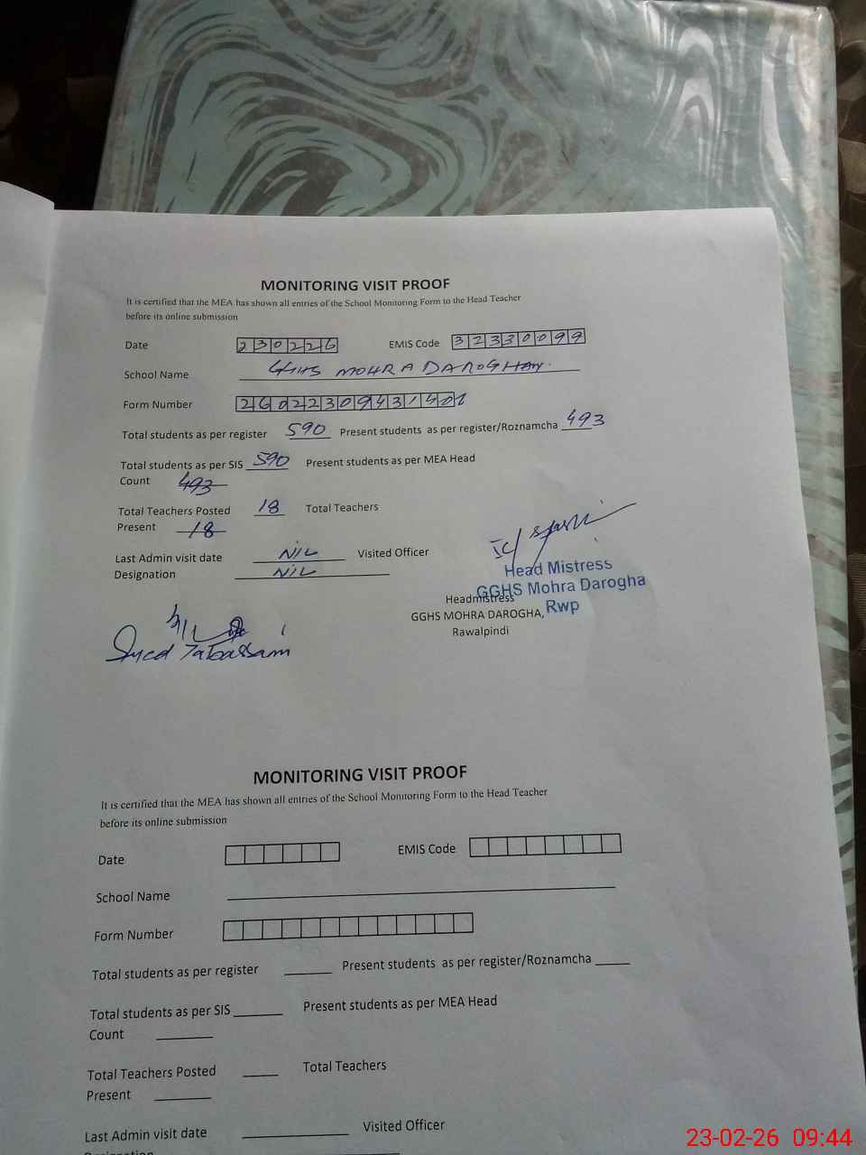 | Attendance Register | Head Teacher | MEA with School | Visit Proof |