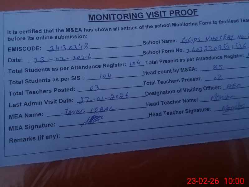 | EMIS Code: 34130348 | Name of School: GGPS KOTHRAY NO.2 | |||