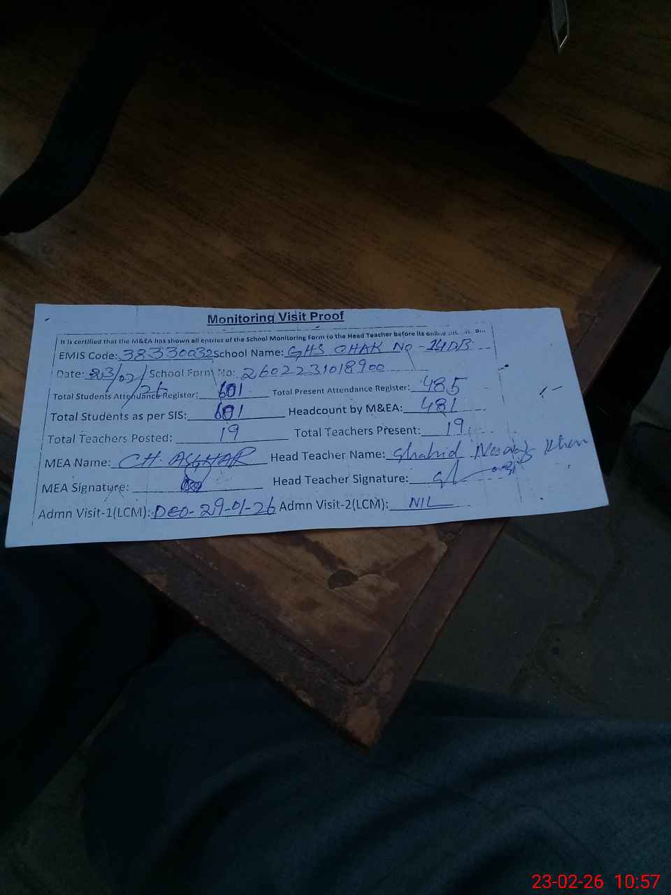 | Attendance Register | Head Teacher | MEA with School | Visit Proof |