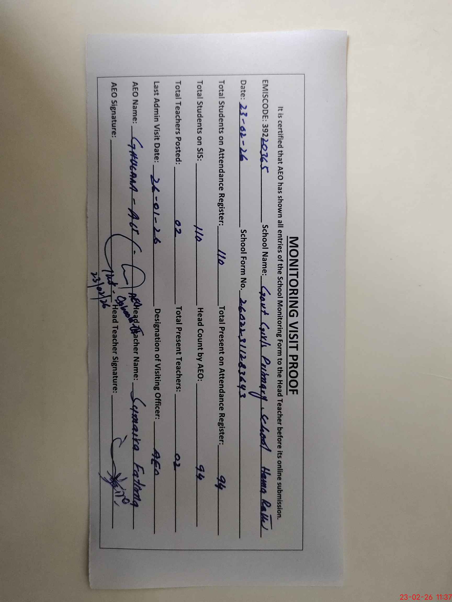 | Attendance Register | Head Teacher | MEA with School | Visit Proof |