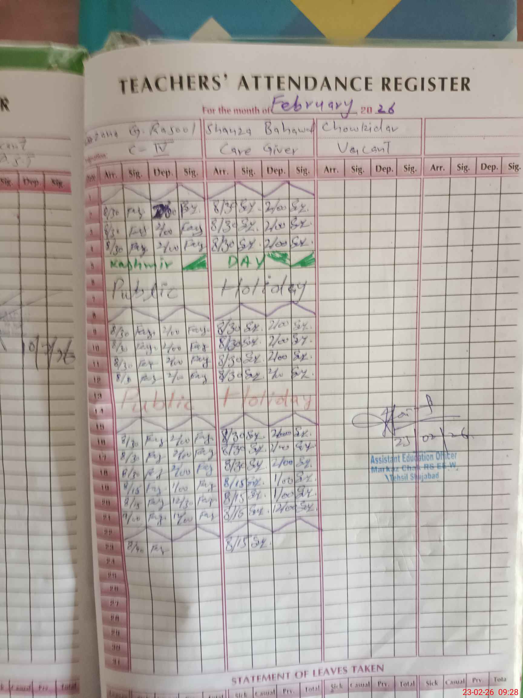 | Attendance Register | Head Teacher | MEA with School | Visit Proof |