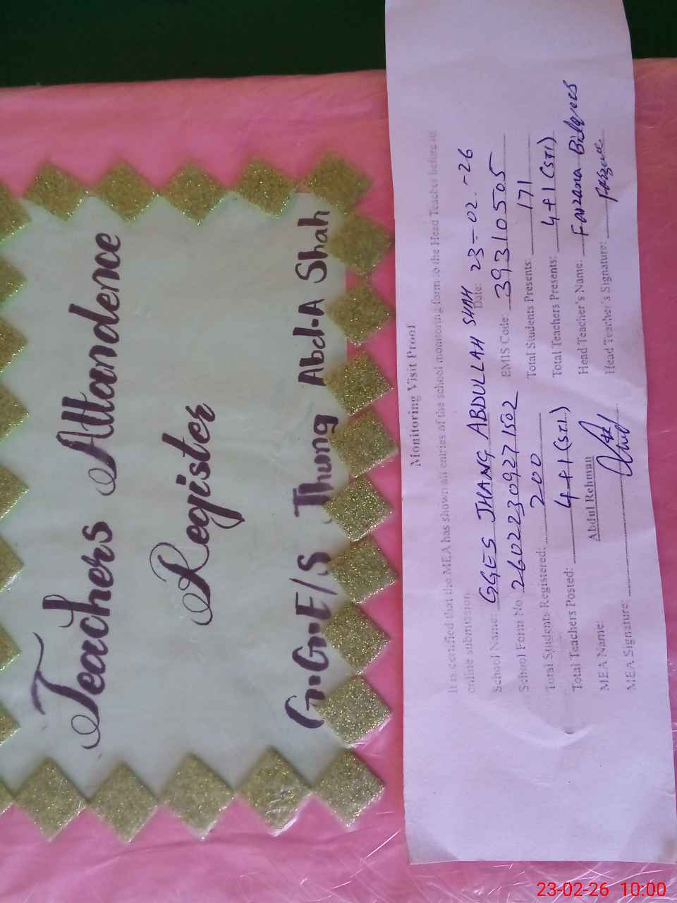 | Attendance Register | Head Teacher | MEA with School | Visit Proof |