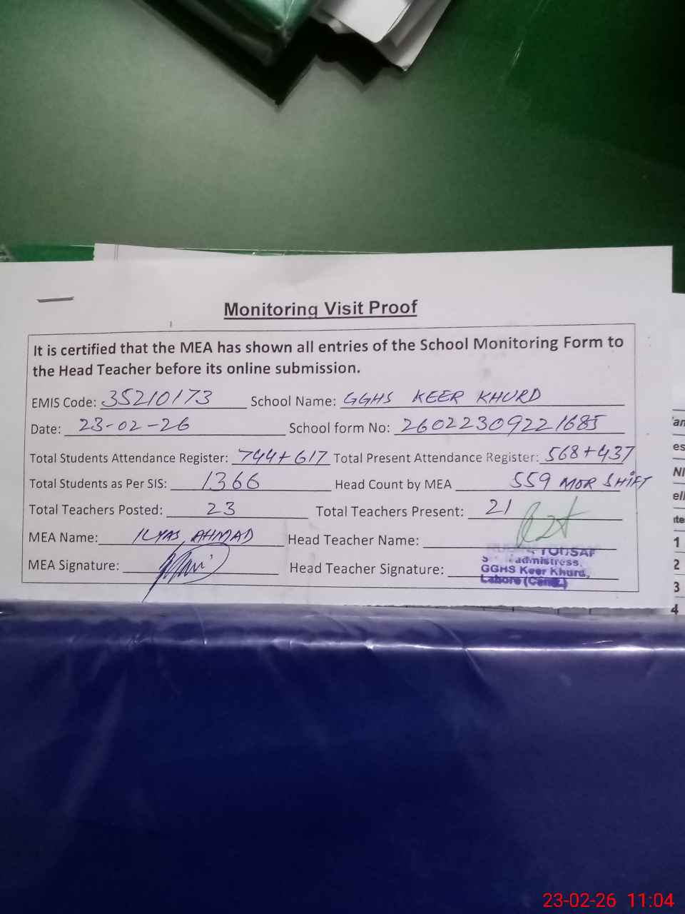 | Attendance Register | Head Teacher | MEA with School | Visit Proof |