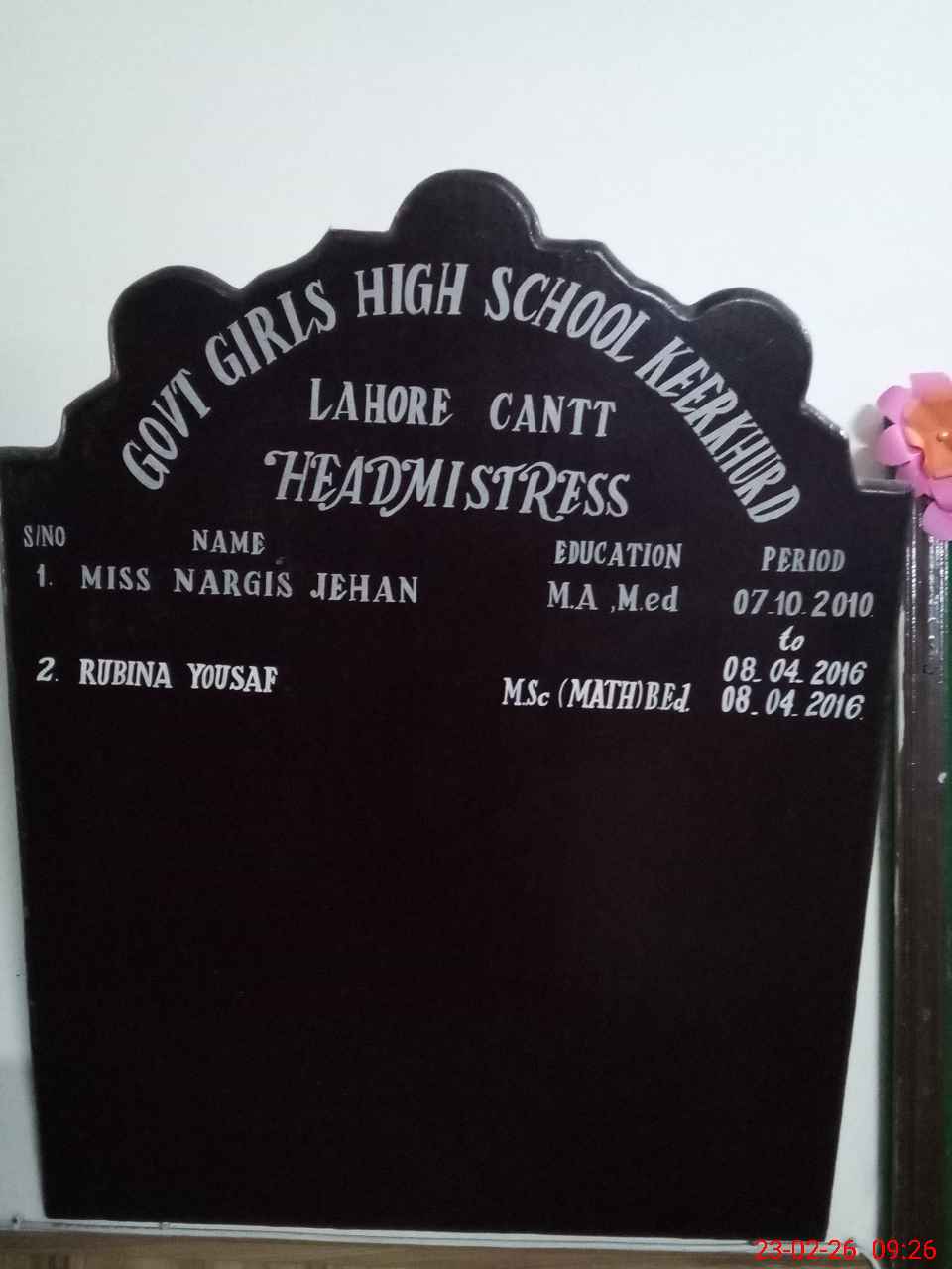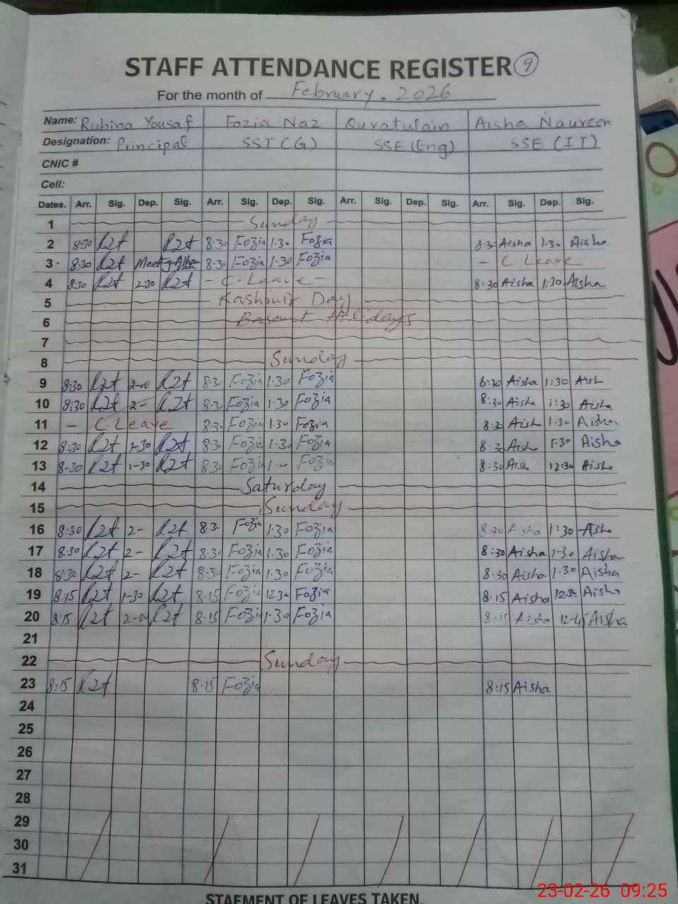 | Remarks (Use Separate Page if Required): Teacher Qurtulain SSE long absent since 13 October 2025 Teacher Amrozia Sharif PST is marked absent today as maternity leave wef 23 February 2026 for 90 days has not been approved so far | |||||